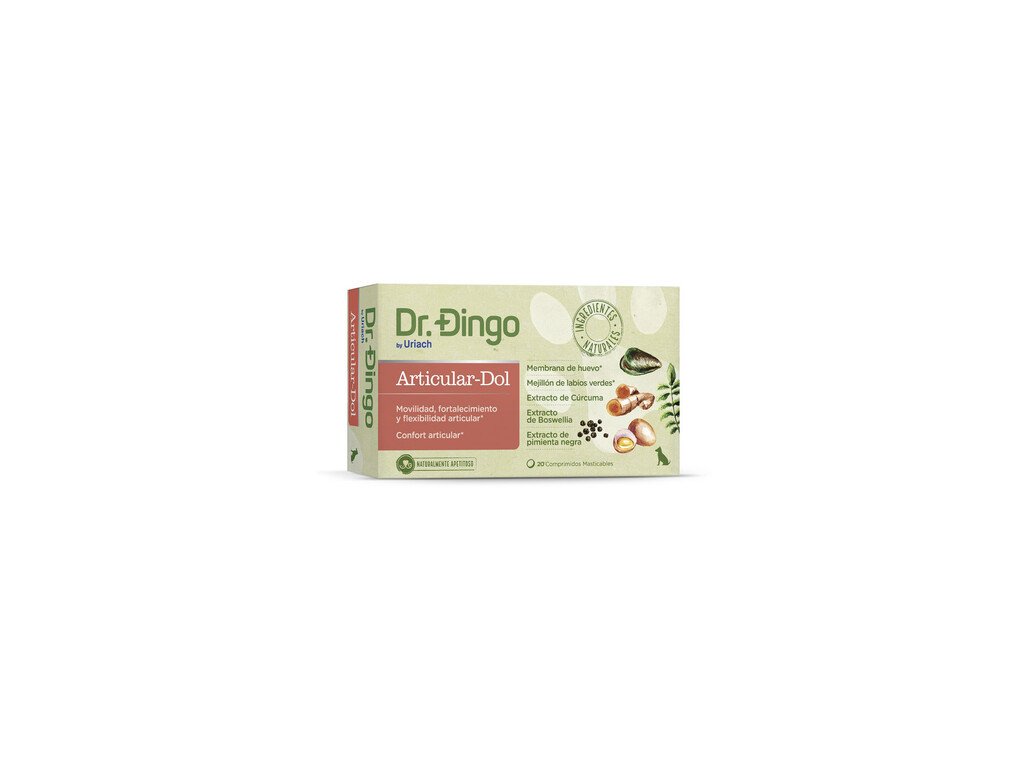 Dr. Dingo Articular Kosti a kĺby je inovatívne a chutné doplnkové krmivo pre psov vo forme žuvacích tabliet, ktoré je vyrobené s prírodnými zložkami, ako je vaječná membrána (zdroj kyseliny hyalurónovej, glukozamínu, chondroitínu a elastínu) a slávka zelenoústa, zdroj omega-3 mastných kyselín, ktoré prispievajú k flexibilite, pohyblivosti a sile kĺbov.