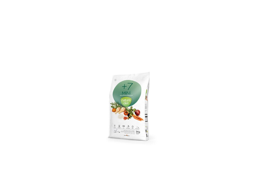 Kompletné a prírodné krmivo pre psy staršie ako sedem rokov. Natura Diet +7 spomaľuje starnutie psov, pomáha predchádzať kognitívnym dysfunkciám a posilňuje zdravie očí a imunitný systém. Kompletné prírodné krmivo pre psov vyrobené z vysokokvalitných a čerstvých ingrediencií, prispôsobené nutričnému profilu psa, ktoré by našiel podľa inštinktu vo voľnej prírode.